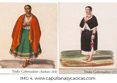 Indias gobernadoras de Ambato. Fuente: tomado de Daza Tobasura, Paula Inés. 2019. "Gobernar en tiempos de cambio: las cacicas de la Audiencia de Quito en el siglo XVIII". Tesis doctoral, FLACSO Ecuador. Tomadas a su vez de Ortiz Crespo, Alfonso, coord. 2005. Imágenes de identidad: acuarelas quiteñas del siglo XIX.